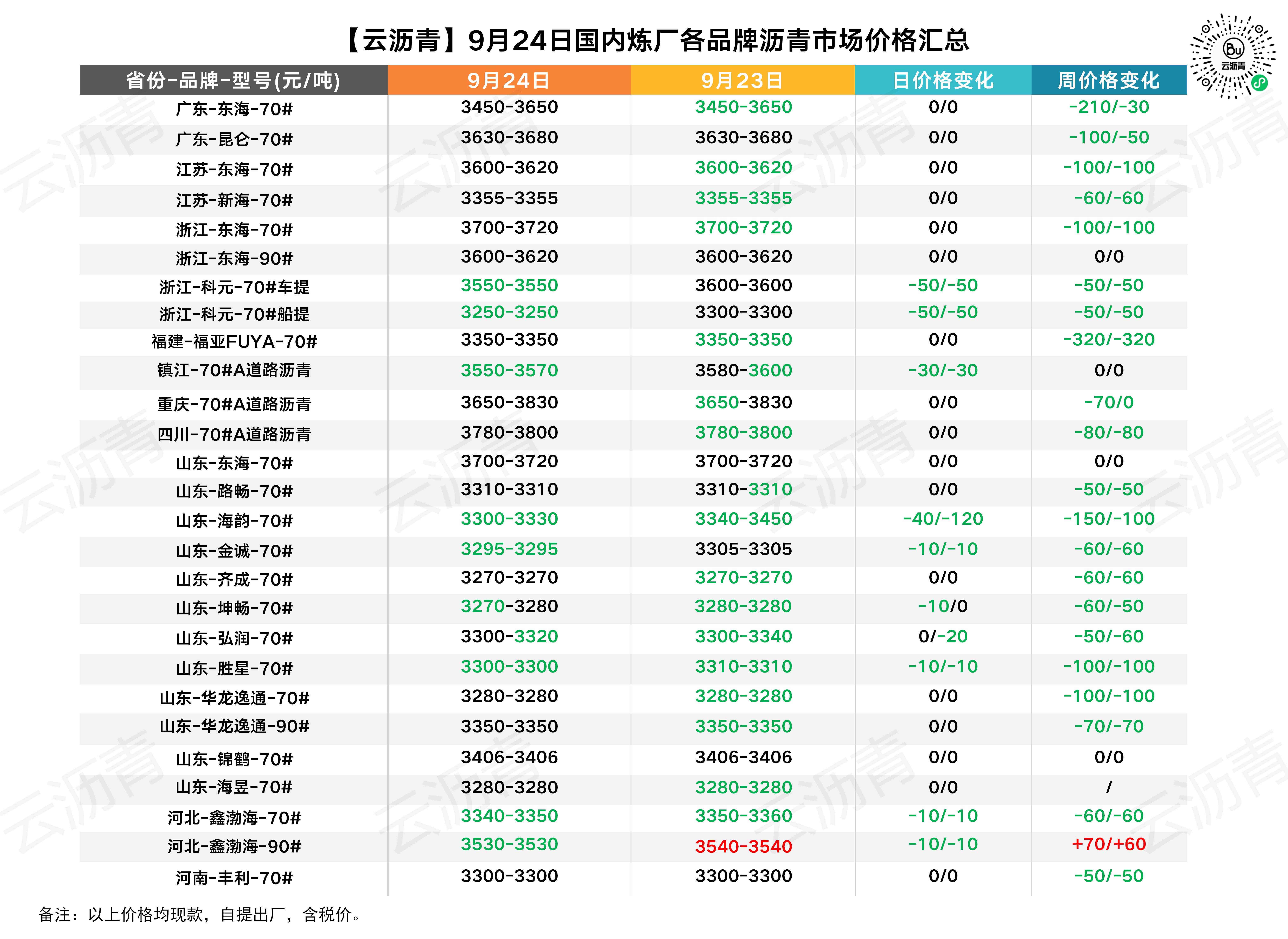 9月24日各品牌沥青价格汇总