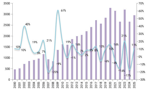 2025年国际原油价格波动区间变化缩窄,布伦特原油价格多数时间在60-80美元/桶区间震荡,成本端较去年大幅走低,带动沥青厂生产利润有所回升,大部分地炼生产积极性较高。据云沥青统计,2025年中国沥青总产量达2947万吨,同比或将增加292万吨,同比上升11%。