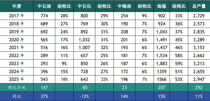 分集团看,2025年地炼沥青产量1,566万吨,同比大幅增加207万吨,上升15%,今年整体原油价格高位回落,沥青厂加工利润大幅修复,带动地炼生产积极性提高。具体来看,京博海南全年保持高产,山东京博、鑫海、胜星、弘润、科元保持稳定生产,盛马化工复产沥青,下半年无棣鑫岳短期生产沥青,带动地炼总体产量大幅增加。