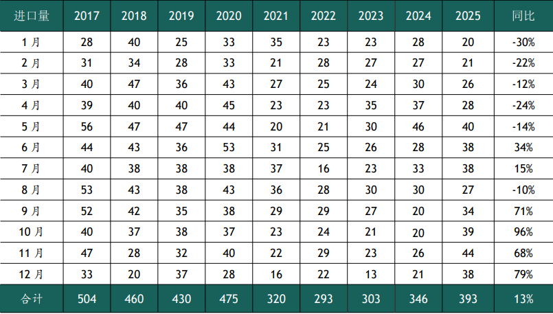 表3.中国沥青进口量(单位:万吨)