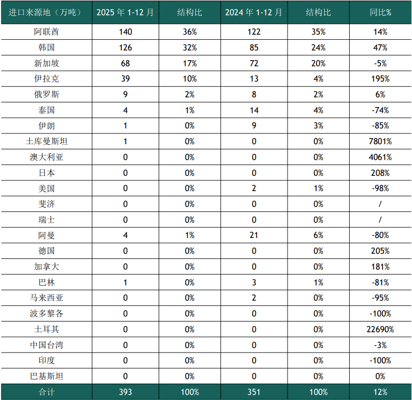 2025年沥青总进口量393万吨,同比增加47万吨,同比上涨13%,详细来看,今年传统进口沥青来源国如东南亚国家,沥青价格相对偏高,今年多数时间明显高于国产沥青,因此国内客户接货积极性有所下降,总进口量大幅缩减。而国内沥青进口商较为青睐的中东沥青进口量再创新高,1-12月中东国家进口沥青总量达142万吨,同比增加9万吨。