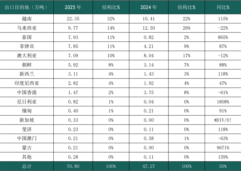 据海关统计数据显示,2025年,我国沥青出口量达70.8万吨,较上年同期增加23.73万吨,同比大幅增长50%。从出口目的地来看,东南亚市场表现尤为亮眼:1-12月国内出口至越南沥青总量22.35万吨,同比激增115%;出口至菲律宾7.85万吨,同比增长87%;出口至泰国7.93万吨,同比大幅攀升865%。出口至东南亚的沥青总量大幅增长主要与京博海南炼厂的产能释放及海外市场布局紧密相关。自2024年底该炼厂实现沥青产品稳定生产后,便同步加快海外市场开拓步伐,持续向东南亚地区稳定供应沥青产品,成为拉动全国沥青出口量增长的核心动力。未来,随着海南岛封关运作落地,京博海南炼厂将进一步依托政策红利与区位优势,深化海外市场布局,稳步扩大市场份额。