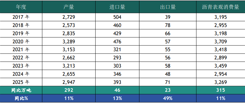 2025年国际原油价格维持60-80美元/桶区间震荡,受制于资金缺口,沥青终端需求释放不及预期,据云沥青统计,2025年中国沥青表观消费量3,269万吨,同比增加315万吨或上升11%。其中,国内炼厂沥青总产量2,947万吨,同比增加292万吨或上升11%;总进口量393万吨,同比增加46万吨或上升13%;总出口量71万吨,同比增加23万吨或上升49%。