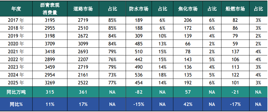 沥青消费主要流向道路市场、防水市场、船燃市场及焦化市场。