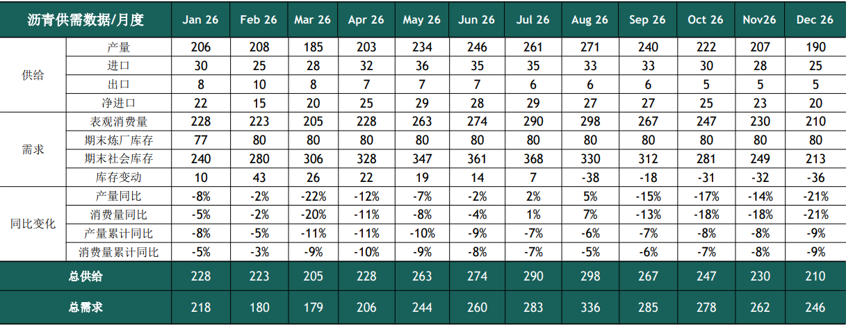 表9.2026年沥青平衡表预测(单位:万吨)